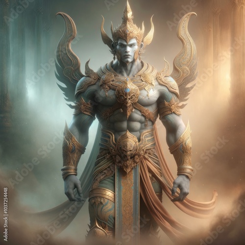 warrior, deity, fantasy, armoring, gold, mythical, powerful, muscle, ornate, epic, guardian, sculpture, intricate, spiritual, hero, glowing, ancient, royals, divine, majestic, crown, supernatural, aethereal, regal, guardian, ceremonial, fierce, magical, strength, heroic, detailed, traditional, sacred, celestial, mystical, strong, legendary