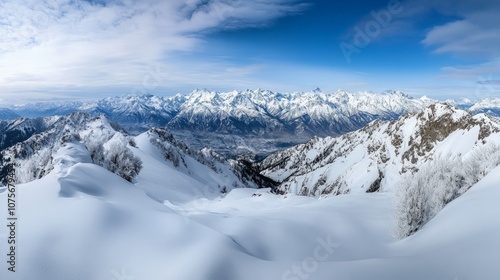 Majestic Himalayan Panorama, sweeping vistas of towering peaks, deep valleys carved by time, and untouched snow glistening under the sun, an awe-inspiring natural wonder.