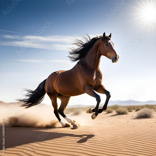 Majestic horse gallops through dusty desert landscape under bright sky in the early afternoon
