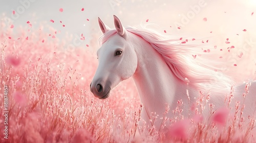 Majestic horse in pink flower field nature photography dreamy landscape