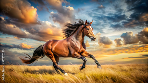 Majestic horse running freely in an open field under a sky, graceful, journey, horse, strength, freedom, symbol, power, majestic