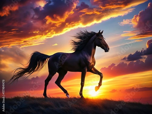 Majestic Horse Silhouette at Sunset, Deep Depth of Field Stock Photo