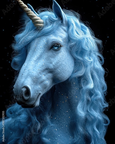 unicorn, horse, blue, fantasy, magical, mythical, creature, mane, horn, fairy tale, majestic, mystical, beautiful, elegant, portrait, head, animal, art, digital, graphic, illustration, design, sparkle, glistering, star, night, dark, background, hair, fur, eye, gaze, serene, peaceful, dreamy, whimsical, wonder, power, grace, mythology, legend, celestial, cosmic