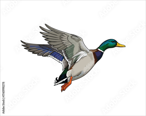 anas platyrhynchos, duck, flying, flight, bird, vector, illustration, wildlife, water bird, animal, nature, wing, feather, beak, avian, plumage, ornithology, drawing, graphic, design, artwork, isolated, white background, colourful, migratory, duck pond, wetland, wild