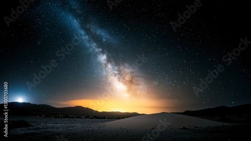 milky way, galaxy, night sky, star, desert, dune, sand, landscape, astronomy, space, celestial, night, darkness, moonlight, mountain, horizon, scenic, nature, beautiful, cosmos, universe, aethereal, vibrant, bright, saturated, photo, image, background, wallpaper