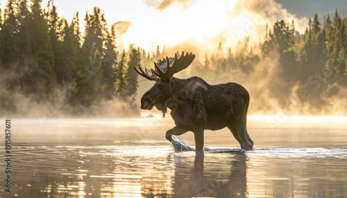 moose, lake, water, sunrise, mist, fog, forest, tree, wildlife, nature, animal, outdoors, landscape, morning, dawn, elk, bull, mammal, american, canada, environment, scene, scenic, travel, adventure, wild, rural, countryside, serene, peaceful, calm, tranquil, beauty, sunlight, gold, light, atmosphere, aquatic, wet, stag, antler, large, powerful, strong, walking, standing, looking