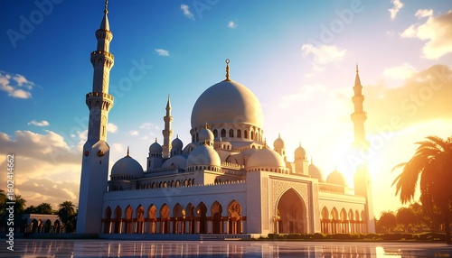 mosque, sunrise, islam, architecture, building, grand, white, dome, minaret, sky, cloud, light, sun, gold, peace, beauty, exterior, arabian, middle, east, religious, spiritual, faith, prayer, holy, place, elegant, scenic, view, digital, illustration, three-dimensional, rendering, imposing, beautiful, stunning, morning, peaceful