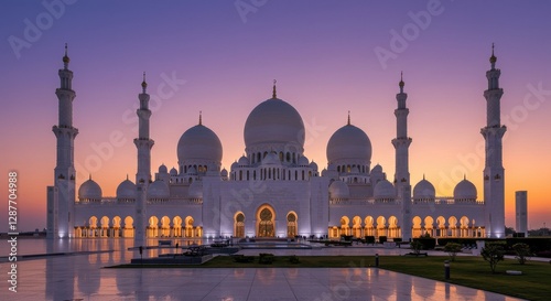 Majestic mosque at sunset with reflective pool and vibrant sky in the background