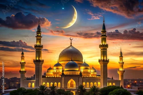 mosque, islam, muslim, architecture, building, religion, islamic, sunset, crescent moon, star, night, sky, ramadan, eid, religious, culture, travel, landmark, dome, minaret, gold, illuminated, beautiful, landscape, city landscape, urban, twilight, evening, spiritual, faith, worship, prayer, traditional, holy, church, middle east, arab, arabian, asia, asian, exterior