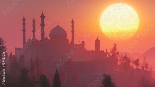 Majestic Mosque Silhouette at Sunset with a Giant Sun