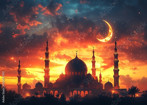 Majestic Mosque Silhouette Stunning Sunset Night Sky Ramadan Red Art Moon Dark Holy Islam Faith