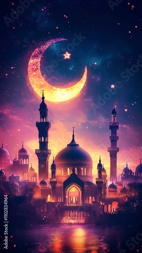 mosque, crescent moon, star, night sky, islamic, ramadan, eid, muslim, religion, faith, spirituality, architecture, building, city, landscape, water, purple, gold, night, mystical, magical, serene, peaceful, tranquil, beautiful, illustration, digital artwork, artwork, fantasy, dreamlike, spiritual, holy, celebration, festival, tradition, culture, heritage, design, background, wallpaper, poster, card, invitation, greeting card