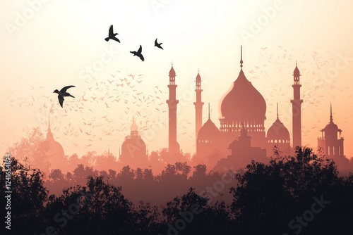 Majestic Mosques at Golden Hour, Silhouette Cityscape with Birds in Flight. A Stunning Digital Illustration of a Peaceful and Spiritual City.