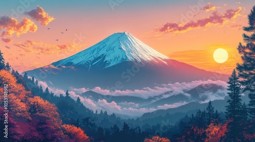 mountain, fuji, sunset, sky, cloud, forest, nature, japan, art, digital, painting, landscape, illustration, mountainous, snow, peak, tree, pine, leaf, red, orange, pink, purple, blue, yellow, gold, sunrise, twilight, dawn, morning, evening, day, night, view, scenic, beautiful, majestic, serene, peaceful, tranquil