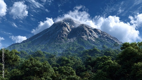 Majestic Mount Hood, Oregon, with its snowy peak towering over a green forest landscape under a summer sky of clouds