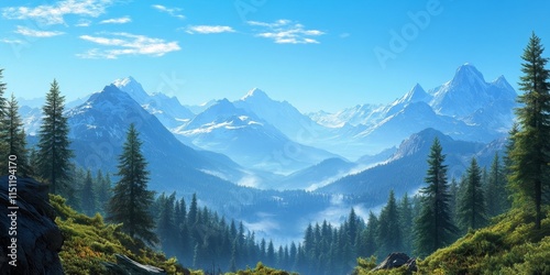 Majestic mountain landscape featuring pines and a clear blue sky, showcasing the beauty of a natural park with stunning views and serene surroundings in a tranquil environment.