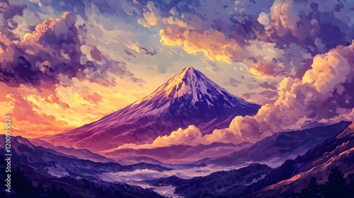 mountain, peak, sunset, cloud, sky, hill, landscape, art, digital, painting, majestic, sunrise, colours, vibrant, purple, orange, yellow, gold, pink, red, blue, hue, shades, tone, texture, style, artistic, scenic, view, nature, scenery, beauty, awe, wonder, tranquil, serene, peaceful, calm, impressive, grand, huge, expansive, enormous, sublime