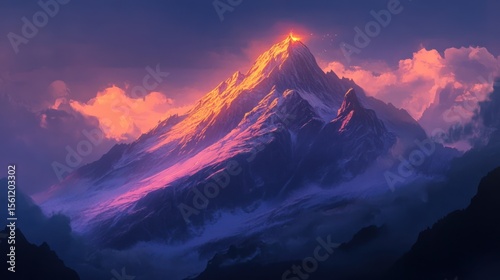 Majestic mountain peak illuminated by vibrant sunset hues and ethereal cloudscapes