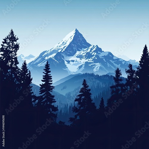 mountain, peak, snowy, serene, tranquil, twilight, forest, tree, pine, nature, landscape, wilderness, majestic, grand, powerful, calm, peaceful, solitude, adventure, exploration, freedom, escape, winter, cold, frost, sky, cloud, alpine, vector, illustration, graphic, design, artwork