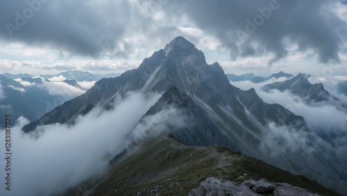 Majestic mountain peak surrounded by clouds with dramatic sky and lush green slopes in the foreground Copy Space