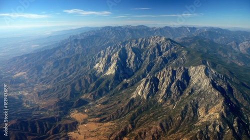 Majestic Mountain Range with Sharp Peaks Surrounded by Clear Blue Sky and Rolling Hills Visible from Above in Sunny Weather