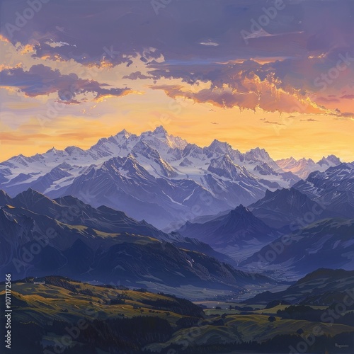 mountain, sunset, sky, range, peak, landscape, nature, cloud, hill, gold, horizon, dawn, alpine, panorama, view, outdoors, scenery, aerial, dramatic, art, painting, illustration, artwork, beautiful, scenic, serene, peaceful, tranquil, majestic, grand, imposing, huge, elevated, mountainous, picturesque, rural, distant, twilight, evening, colours, blue, purple, orange, yellow, white