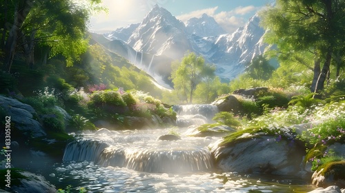 Majestic Mountain Stream Flowing Through Lush Forest Landscape with Towering Peaks in the Background