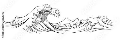 wave, ocean, sea, water, art, drawing, line, line, black, white, monochrome, graphic, design, illustration, japanese, style, print, artwork, abstract, nature, aquatic, marin, surge, crest, trough, current, tide, foam, spray, curl, ripple, undulation, movement, dynamic, energy, power, peace, serenity, calm, beauty, elegance, simplicity, minimalism