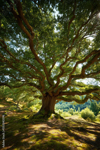 Majestic Old Oak Tree With Dense Branches And Leaves, Sunlight Filtering Through Canopy, Symbolizing Strength, Wisdom, Peace, And Nature's Timeless Beauty In Bright Forest Environment