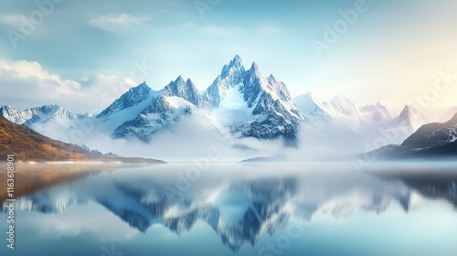 Majestic peaks embrace a calm lake, mirrored skies evoke tranquility, a peaceful retreat in nature's grandeur