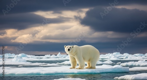 polar bear, arctic, floe, glacier, climate change, global warming, wildlife, animal, mammal, predator, carnivore, endangered species, conservation, nature, wilderness, environment, iceberg, ocean, water, ice, glacé, cold, landscape, scenic, beautiful, north pole, habitat, survival, vulnerable, strength, powerful, majestic, outdoors, icy, snow, dramatic sky, overcast, threat, ecology, iceberg