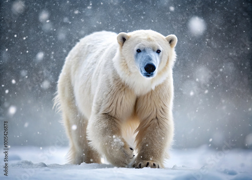 majestic polar bear walks through snowstorm, showcasing its thick white fur and powerful presence. snowy landscape adds to serene yet wild atmosphere
