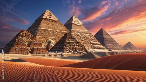 Majestic pyramids stand tall against a vibrant sunset, their ancient stones bathed in warm, golden light. A timeless scene of history and wonder.