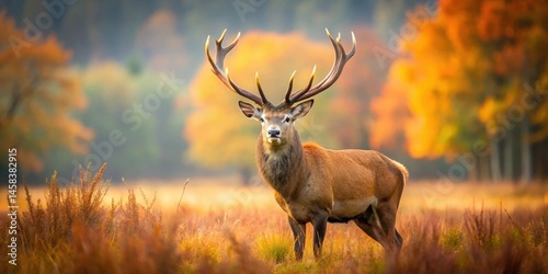 Majestic Red Deer in Autumn Meadow, autumn, red deer, autumn, red deer, animal behavior, meadow, trees, grass