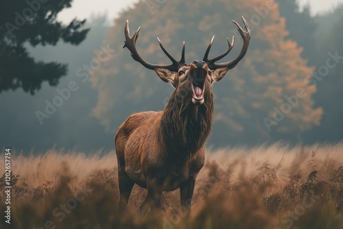 Majestic red deer stag with large antlers, open mouth in a field. Ideal for wildlife, nature, or autumn themes, evokes power and wildness.