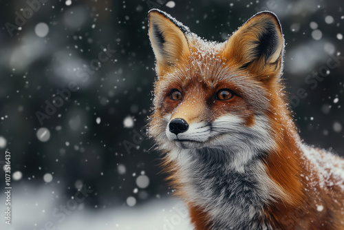 Majestic red fox with snow-dusted fur gazes intently amidst a serene snowy backdrop, embodying the essence of winter wilderness beauty.