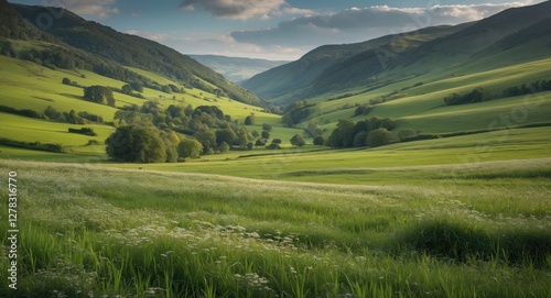 Majestic rolling hills and lush green meadows under a vibrant sky create a serene landscape ideal for nature lovers and tranquil retreats.