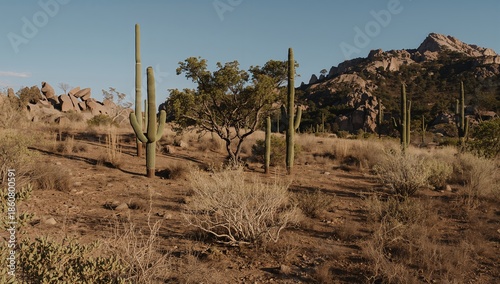 saguaro, desert landscape, arizona, sonoran desert, arid, cactus, succulent, nature, wildlife, botany, flora, plant, growth, spiky, green, prickly, desert plant, southwest, rocky mountain, mountain chain, hillside, dry, barren, scrubland, bush, shrub, grass, dry grass, sunlight, golden hour, sunset, sunrise, clear sky, blue skies, serene, peaceful, tranquil, scenic, vista, outdoors, wilderness, natural beauty, ecosystem, environment, geology, rock formation, erosion, timeless, iconic