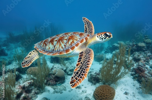 Majestic Sea Turtle Gracefully Swimming Through Vibrant Coral Reef Under Crystal-Clear Ocean Water Amidst Colorful Marine Life and Lush Sea Vegetation