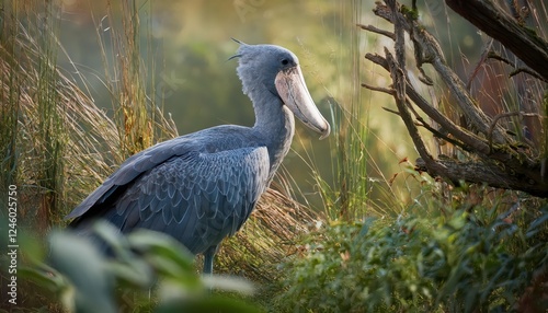 Majestic Shoebill Strikingly Framed by the Dusky Swamplands, showcasing the Regal Birds Unique Beak against Rich Sunset Tones and the Mysterious Allure of the Wetlands.
