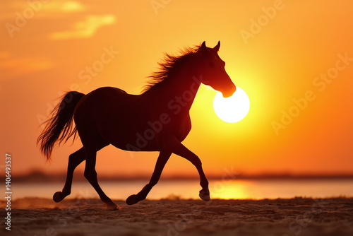 horse, silhouette, sunset, sun, animal, equine, mammal, sand, 2026, lunar, new, year, chinese, sky, sunrise, nature, desert, dusk, mare, fast horse, ride, freedom, gallop, mustang, arabian, background, sunbeam, light, bright, landscape, beach, coast, water, river, sunlight, evening, morning, domestic, farm animal, farm, symbol, cloud, beautiful, beauty, run, running, holiday