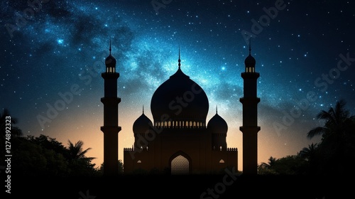 Majestic Silhouette of Mosque Against Starry Night Sky with Cosmic Background