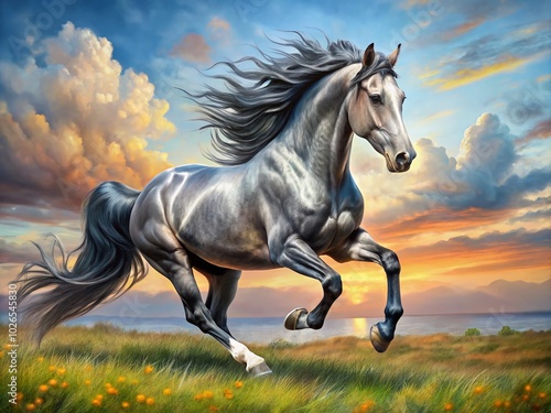 Majestic Silver Black Horse Galloping in a Serene Landscape Captivating Beauty of Nature and Equine Graceful Movement