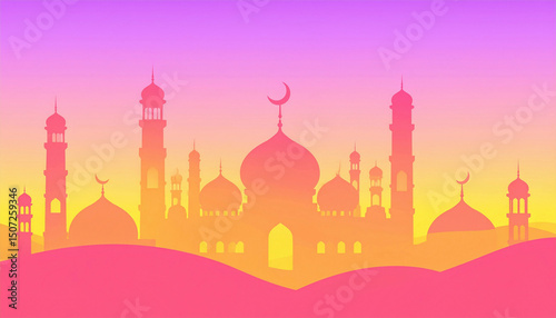 Majestic skyline at sunset during hajj celebrations capturing the essence of spirituality and unity. Gradient illustration.