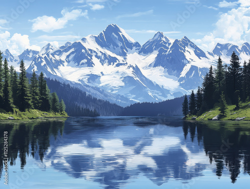Majestic snow capped mountains reflect in serene lake surrounded by lush pine trees, creating tranquil and picturesque landscape
