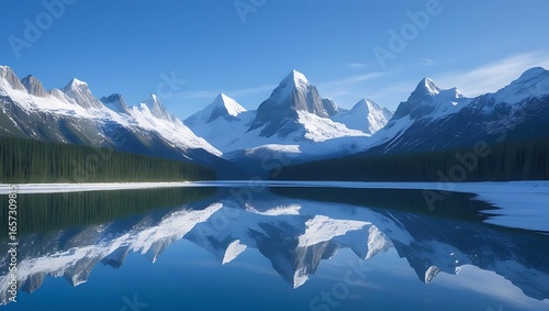Majestic snow capped mountains reflected in a calm lake under a clear blue sky