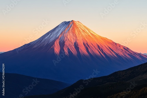 Majestic snow-capped mountain at sunrise with vibrant colors illuminating the landscape