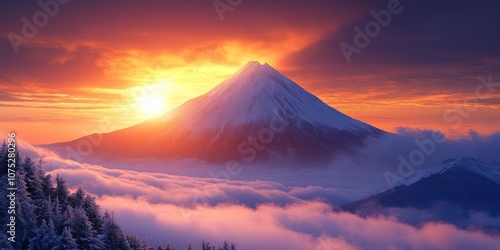 Majestic snow-capped mountain peak at sunrise with clouds.