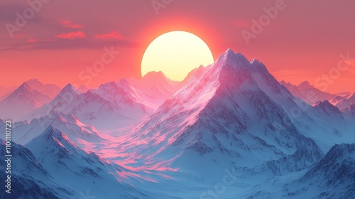 mountain, snow, sunset, sun, sky, peak, landscape, winter, cold, serene, majestic, beautiful, nature, scenic, view, horizon, cloud, light, ray, pink, orange, red, blue, purple, huge, wilderness, tranquil, peaceful, calm, awe, inspiring, breathtaking, power, energy, altitude, high, elevation, glacé, chilly, ice, frost