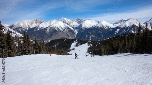 Majestic snowy mountains with skiers gliding down the slopes, surrounded by dense pine forests under a bright winter sky.
